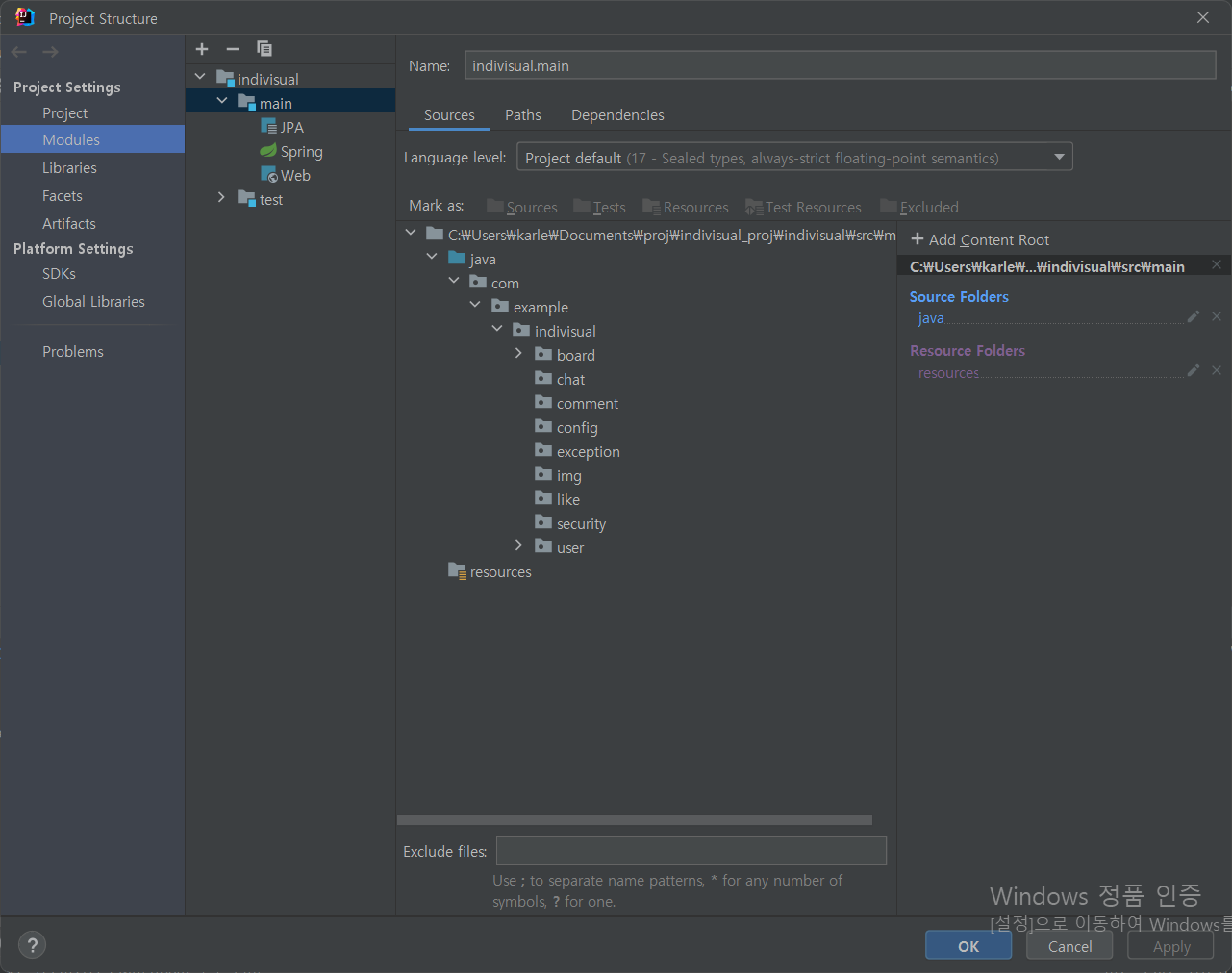 Project Structure -> Modules 에서 보면 각종 환경설정을 다시 설정할수있고, 폴더 구조 또한 볼수있다.